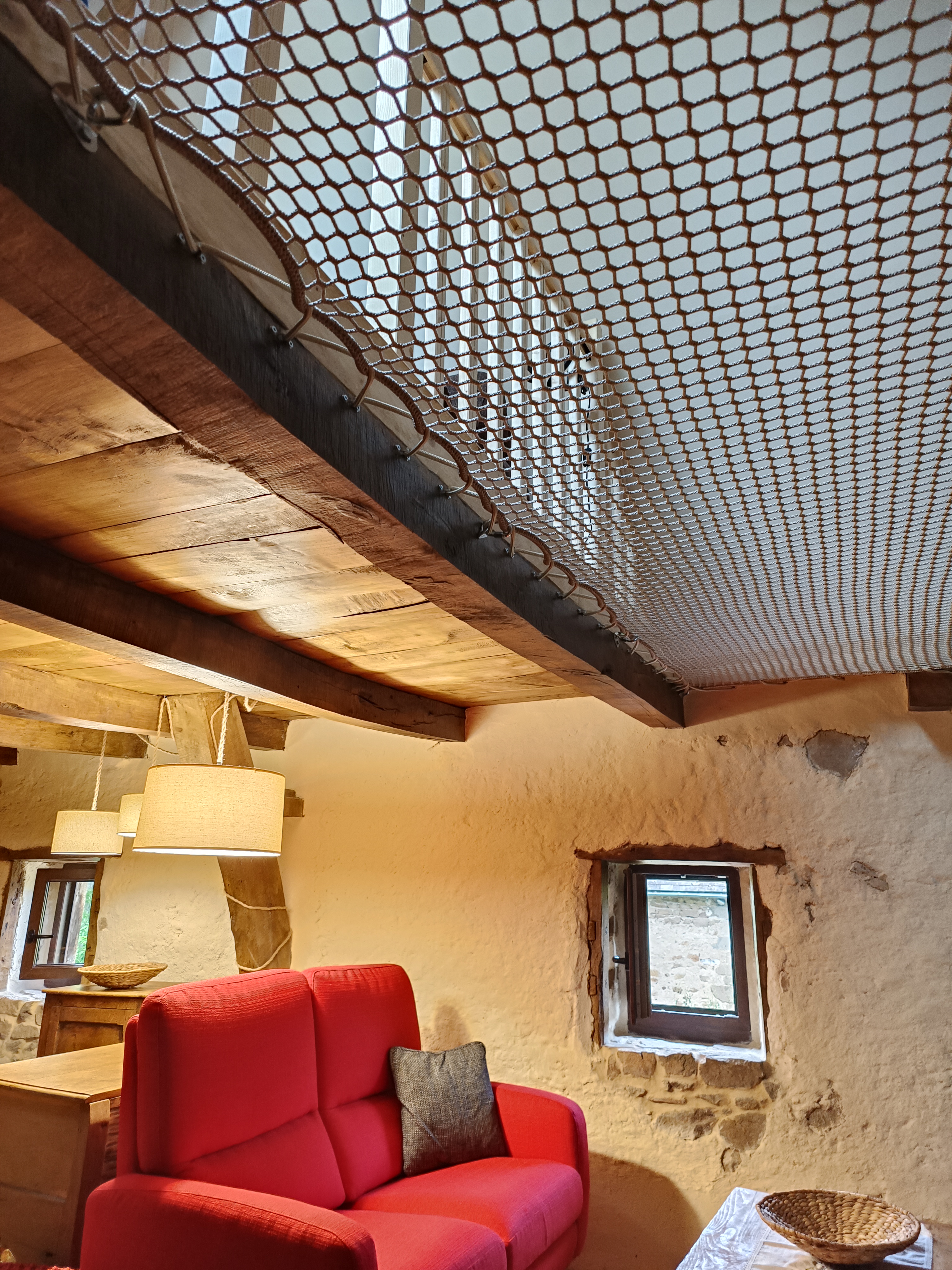 L’aménagement de notre gîte s’inspire d’un séjour dans une cabane avec ses trois niveaux, ses deux entrées, son escalier en colimaçon et son échelle, ses poutres apparentes sur le plafond en bois ; une ambiance cosy où il fait bon vivre…