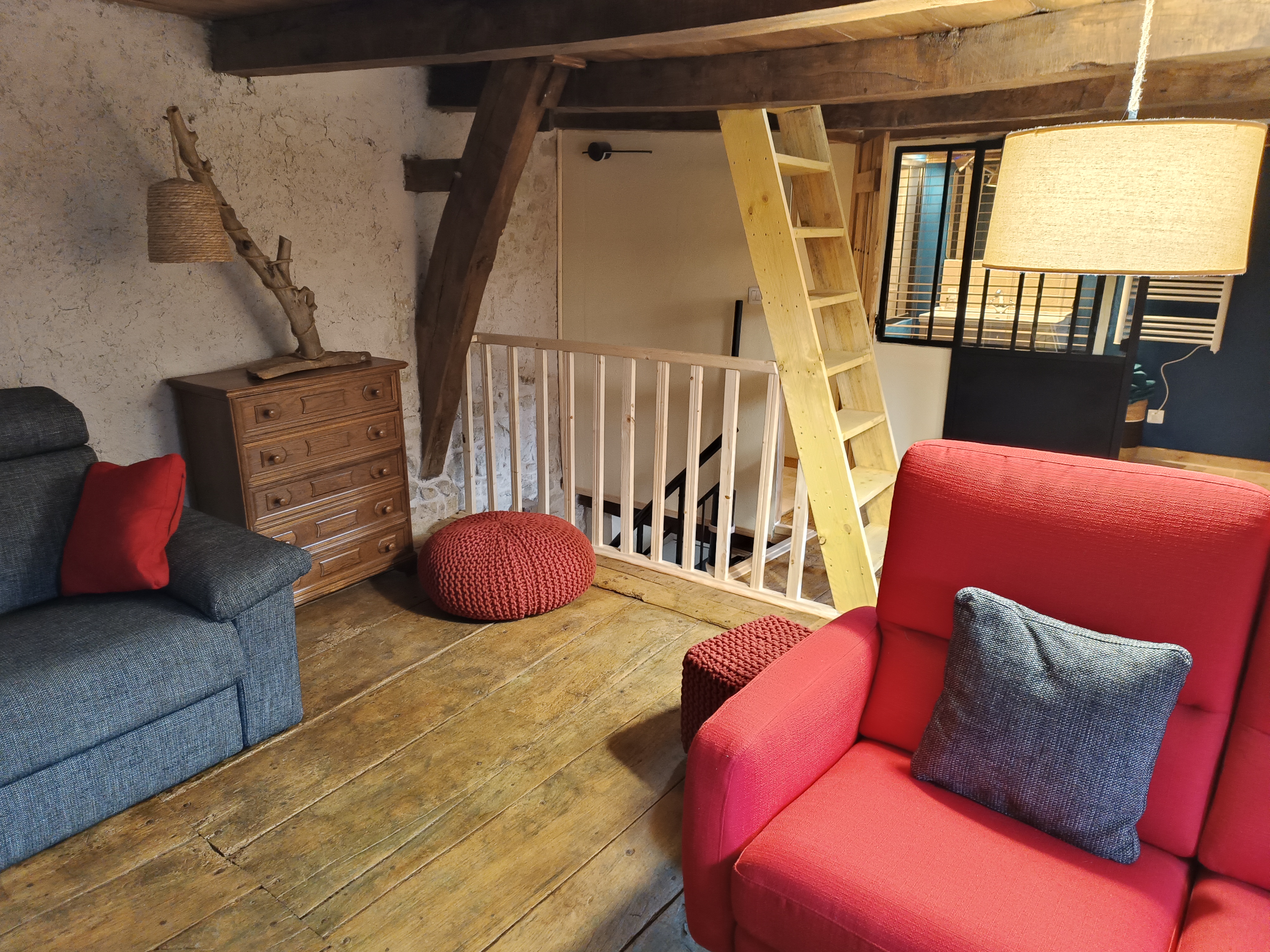L’aménagement de notre gîte s’inspire d’un séjour dans une cabane avec ses trois niveaux, ses deux entrées, son escalier en colimaçon et son échelle, ses poutres apparentes sur le plafond en bois ; une ambiance cosy où il fait bon vivre…